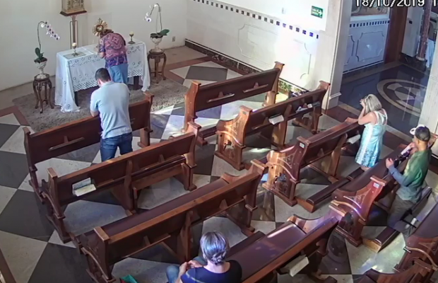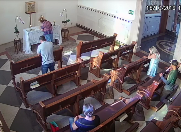 As imagens mostram quando o suspeito também se ajoelha e finge rezar. Segundos depois ele começa a mexer na bolsa. O homem percebe, porém, que é observado por uma outra fiel sentada em um banco ao lado. O suspeito acena para ela, finge rezar novamente e momentos depois coloca a mão na bolsa. Então, ele retira o celular e o coloca no bolso.