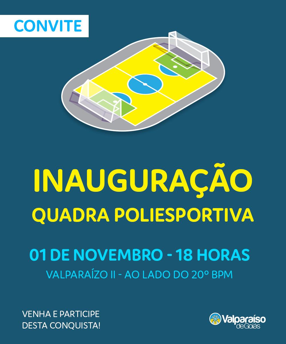 Amanhã vamos inaugurar a reforma de mais uma quadra poliesportiva em nossa cidade. Desta vez é no bairro Valparaíso II, ao lado do batalhão da PM. Nossa gestão reconhece as demandas da comunidade e sabe da importância da prática esportiva, do lazer e da interação social. Venha participar da inauguração amanhã, às 18 horas. Espero você! Um abraço!