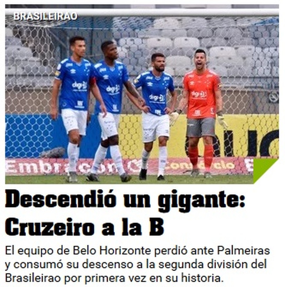 O rebaixamento do Cruzeiro à Série B do Campeonato Brasileiro ganhou as manchetes da imprensa internacional. O inédito descenso, a queda de um clube vitorioso e o vandalismo provocado por torcedores após a derrota para o Palmeiras, por 2 a 0, no Mineirão, foram destaque. Confira:
