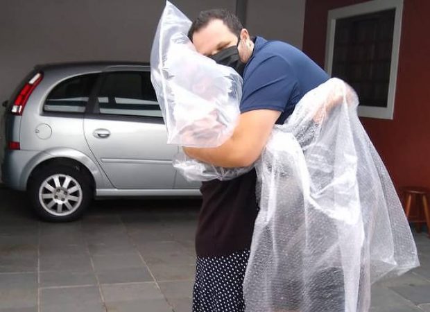 Na segunda semana de maio, ela comprou um plástico bolha e cortou para virar uma espécie de saia vestida pelo pescoço. No rosto, utiliza uma máscara, um protetor feito de acrílico e um saco plástico grande e largo (para entrar ar). Antes do encontro, a roupa é higienizada com álcool 70 em spray. “Para a pessoa que abraçar não ter dúvida de que está protegida”, conta.