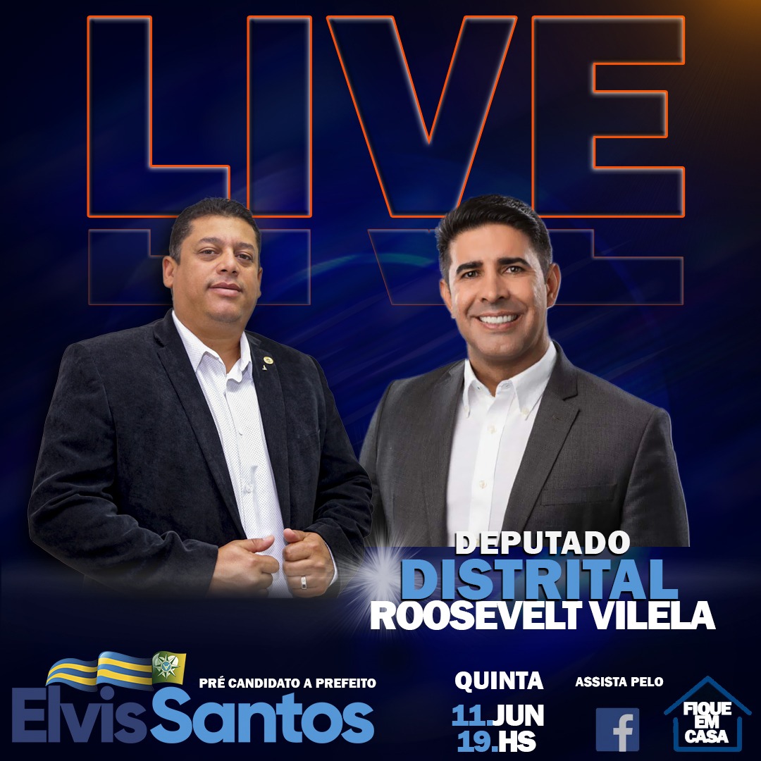 Cidade / DestaquesAmanhã live do Elvis Santos 10 de junho de 2020 Amanhã as 19:00 live Elvis Santos,com deputado distrital Roosevelt Vilela