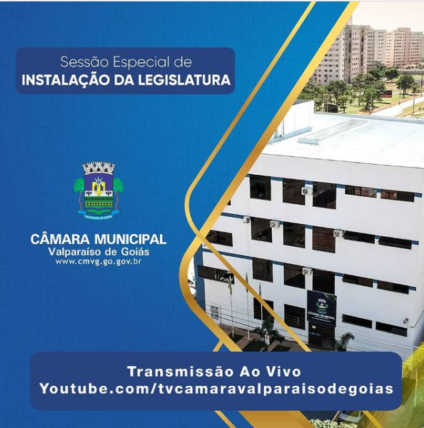 Cidade / DestaquesA Sessão Especial de Instalação da Legislatura 2021-2024 começará em instantes 1 de fevereiro de 2021 Bom dia valparaisenses. A Sessão Especial de Instalação da Legislatura 2021-2024 começará em instantes, com transmissão ao vivo pela TV Câmara Valparaíso de Goiás. acesse o link: bit.ly/39wUi3w