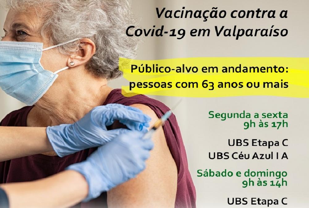A campanha de vacinação contra a Covid-19 avança mais uma etapa, em Valparaíso de Goiás. A partir desta segunda-feira (26/04), serão contemplados os idosos com 63 anos de idade ou mais.