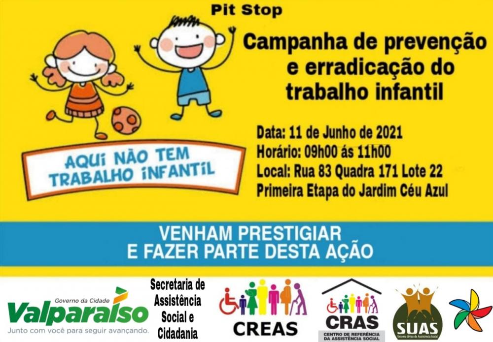 O ação será feita em forma de pit stop pela manhã, das 9h as 11h, na Primeira Etapa do Jardim Céu Azul, abordando motoristas e pedestres para alertar a respeito da importância da sociedade agir em conjunto para reduzir a exploração da mão de obra infantil.