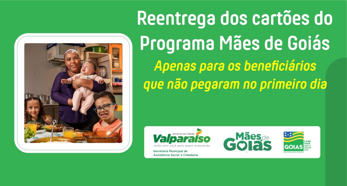 O Mães de Goiás, programa de transferência de renda do Governo do Estado de Goiás, em parceria com o Governo da cidade de Valparaíso do Goiás e sua Secretaria Municipal de Assistência Social e Cidadania, chega neste mês de Abril com a 4ª entrega dos cartões para os beneficiários que não conseguiram retirar o seu benefício nos eventos anteriores.