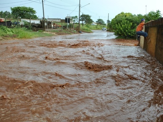 A enxurrada carrega a moradora por alguns metros até que um grupo de pessoas que estava mais a frente consegue segurá-la. Segundo o comerciante, a mulher não se feriu.